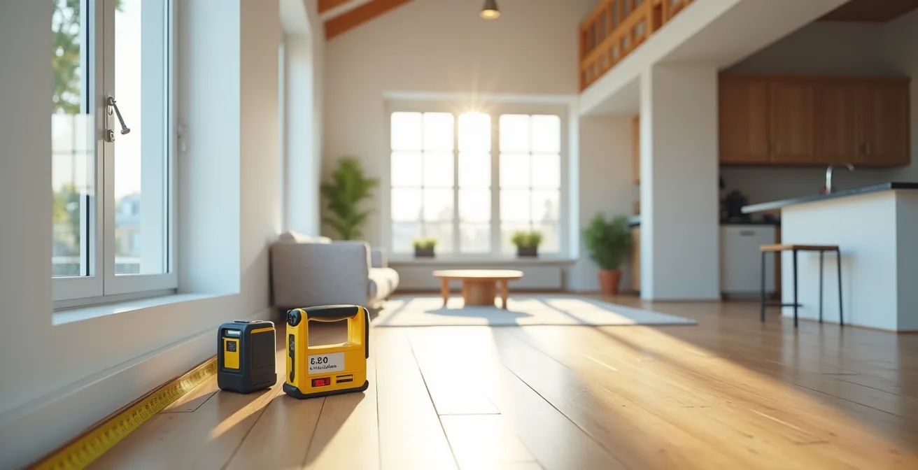 Le mesurage part de la surface de plancher « des locaux clos et couverts après déduction des surfaces occupées par les murs, cloisons, marches et cages d’escalier, gaines, embrasures de portes et de fenêtres ». Concrètement, le diagnostiqueur mesure la pièce de plinthe à plinthe, puis soustrait tous ces éléments. Cela requiert un matériel de précision, comme un télémètre laser, et une méthodologie rigoureuse pour ne rien omettre.